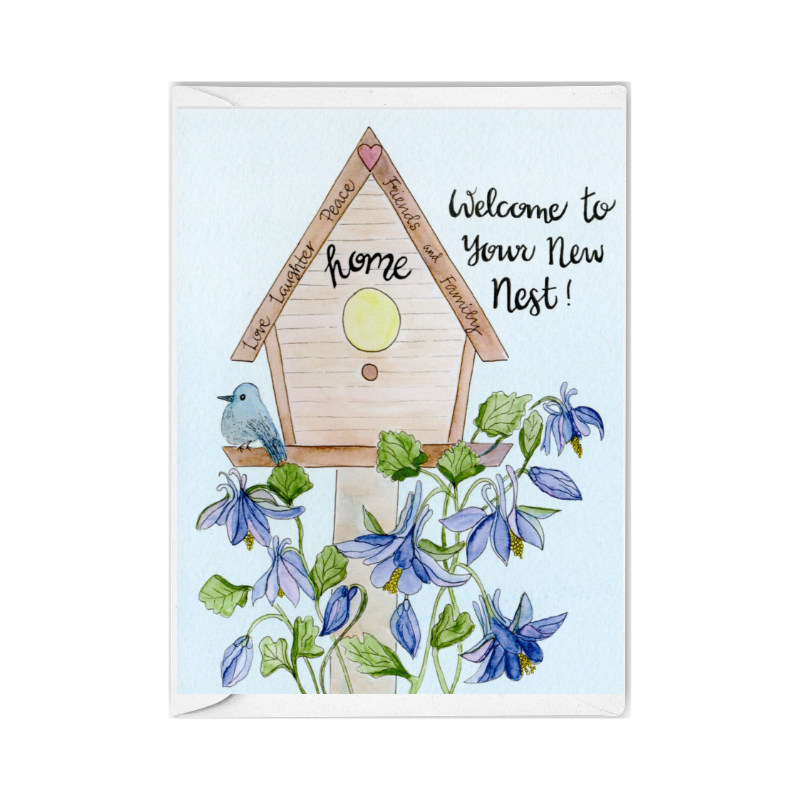 Lovely watercolor columbines surround the home of this new blue bird- a house filled with love, laughter, peace, and friends and family. Share joy with anyone enjoying the comforts of a new home.