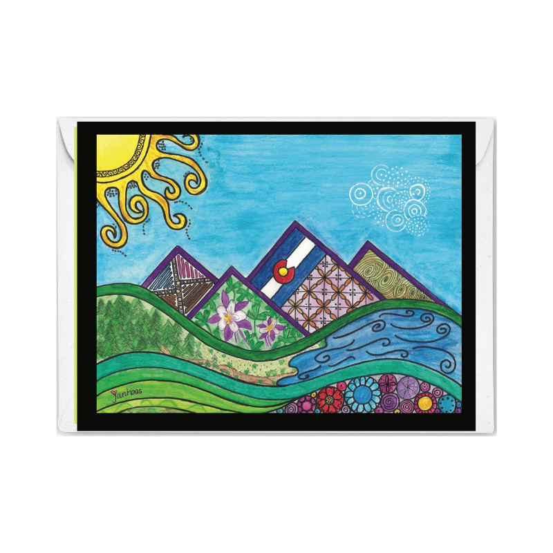 A whimsical, popular watercolor and pen rendition of the Colorado Flag on the mountains. Perfect to share with Colorado lovers.