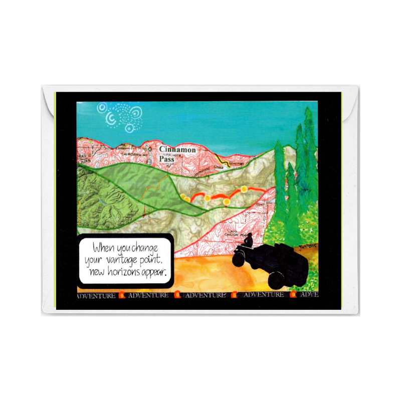 In this Variety series card, topographical maps of Cinnamon Pass create the collage which says, "When You Change Your Vantage Point, New Horizons Appear."