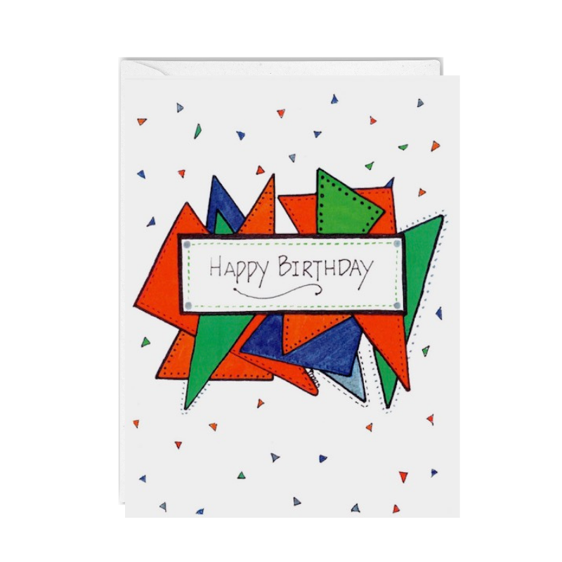 Primary colored triangles highlight a Happy Birthday message. Perfect as a more gender neutral card, ready for your own message.