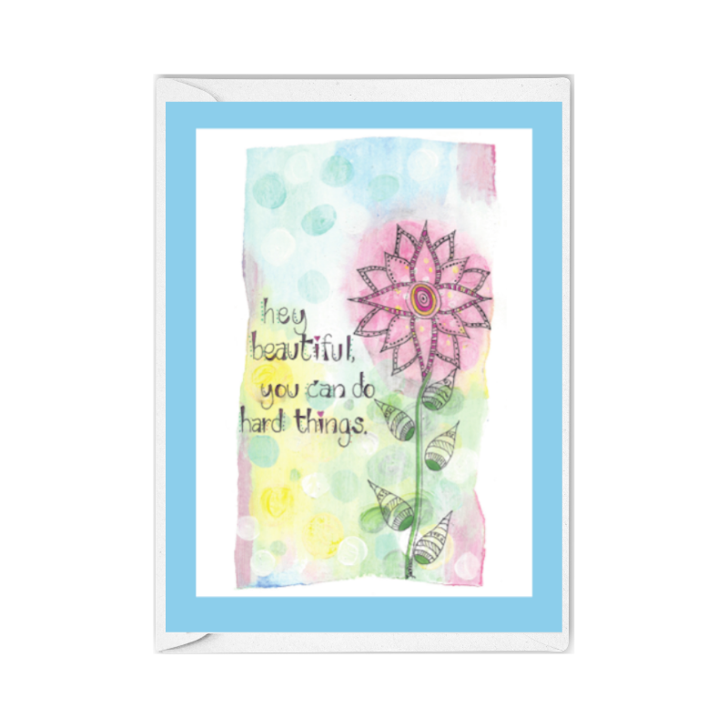 This colorful card falls into the category of multi-purpose encouragement. So often we want to let someone know we are thinking of them and the challenges they face. Perhaps someone is facing an illness, a loss, an uncertain future. This card will remind them that you are thinking of them, and they are not alone on their journey.